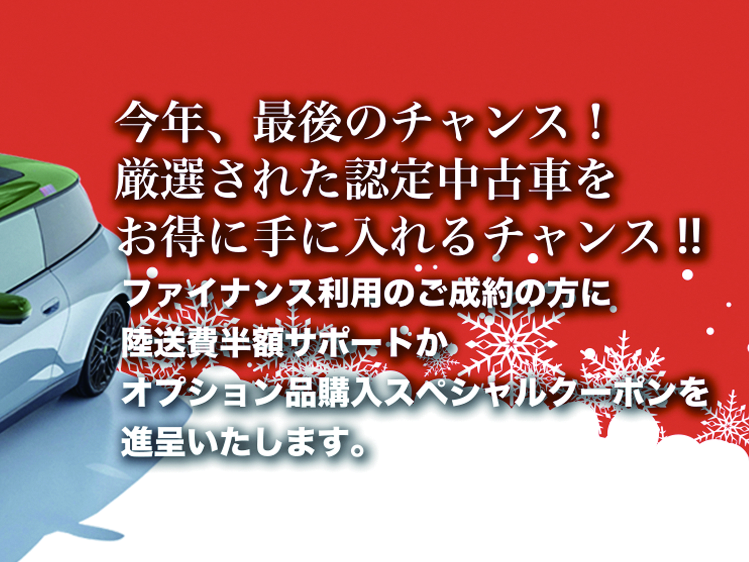 今年最後のチャンス!厳選された認定中古車をお得に手に入れるチャンス!!BMWファイナンスご利用の方に「陸送費半額サポート」か「オプション品購入スペシャルクーポンプレゼント」のどちらかをお選び頂けます。
